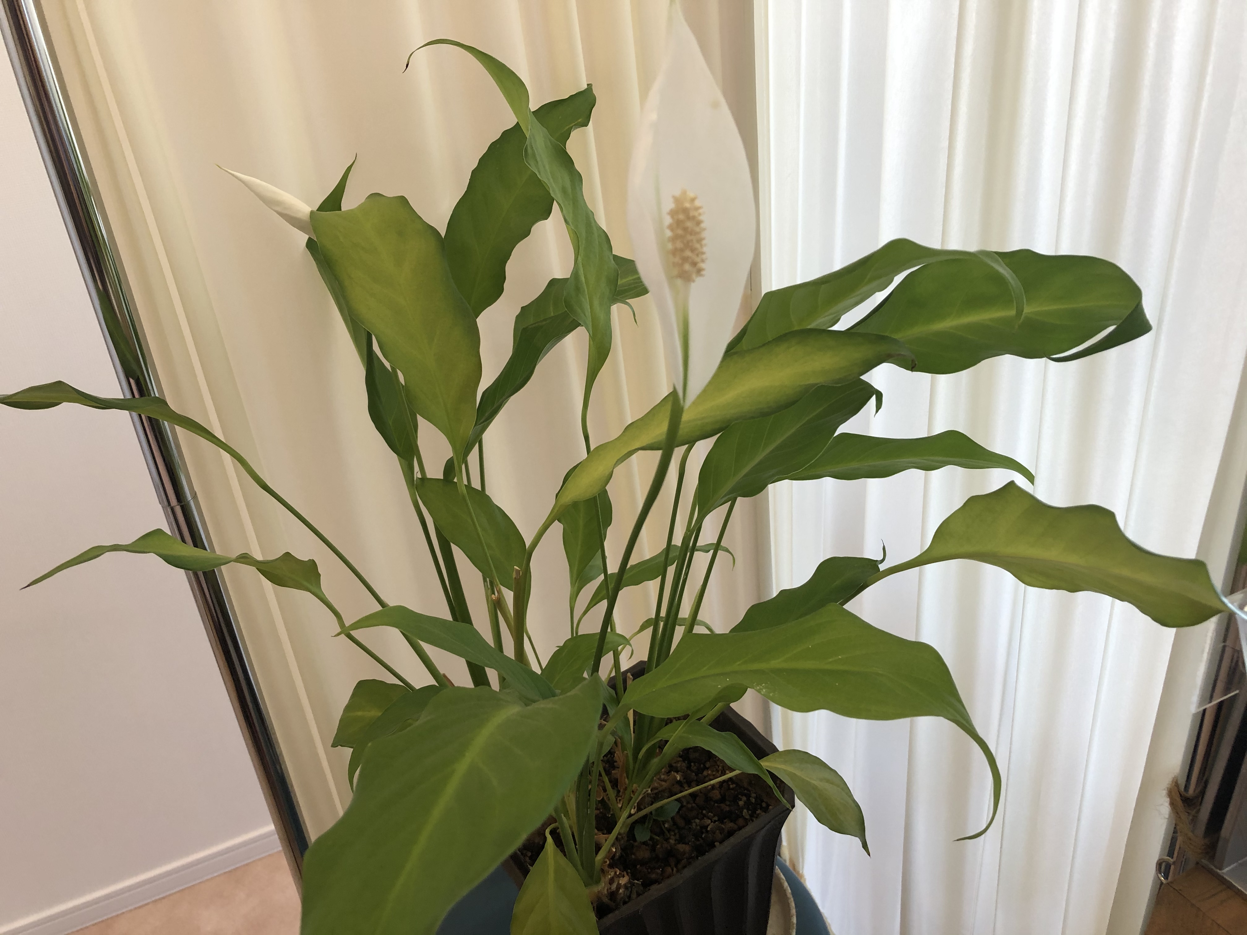 ポートカイロの受付の側にある、観葉植物(スパティフィラム)に白い花が咲きました♡
