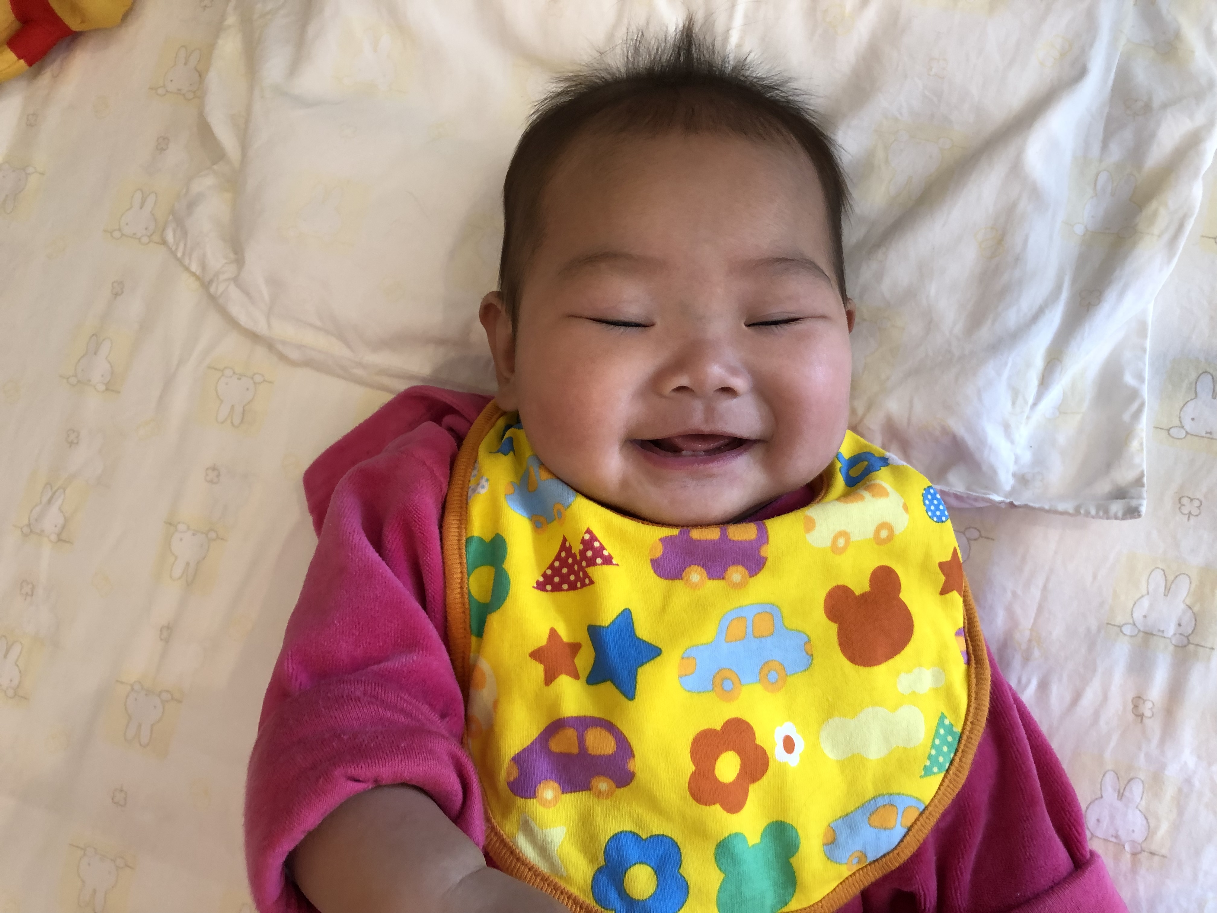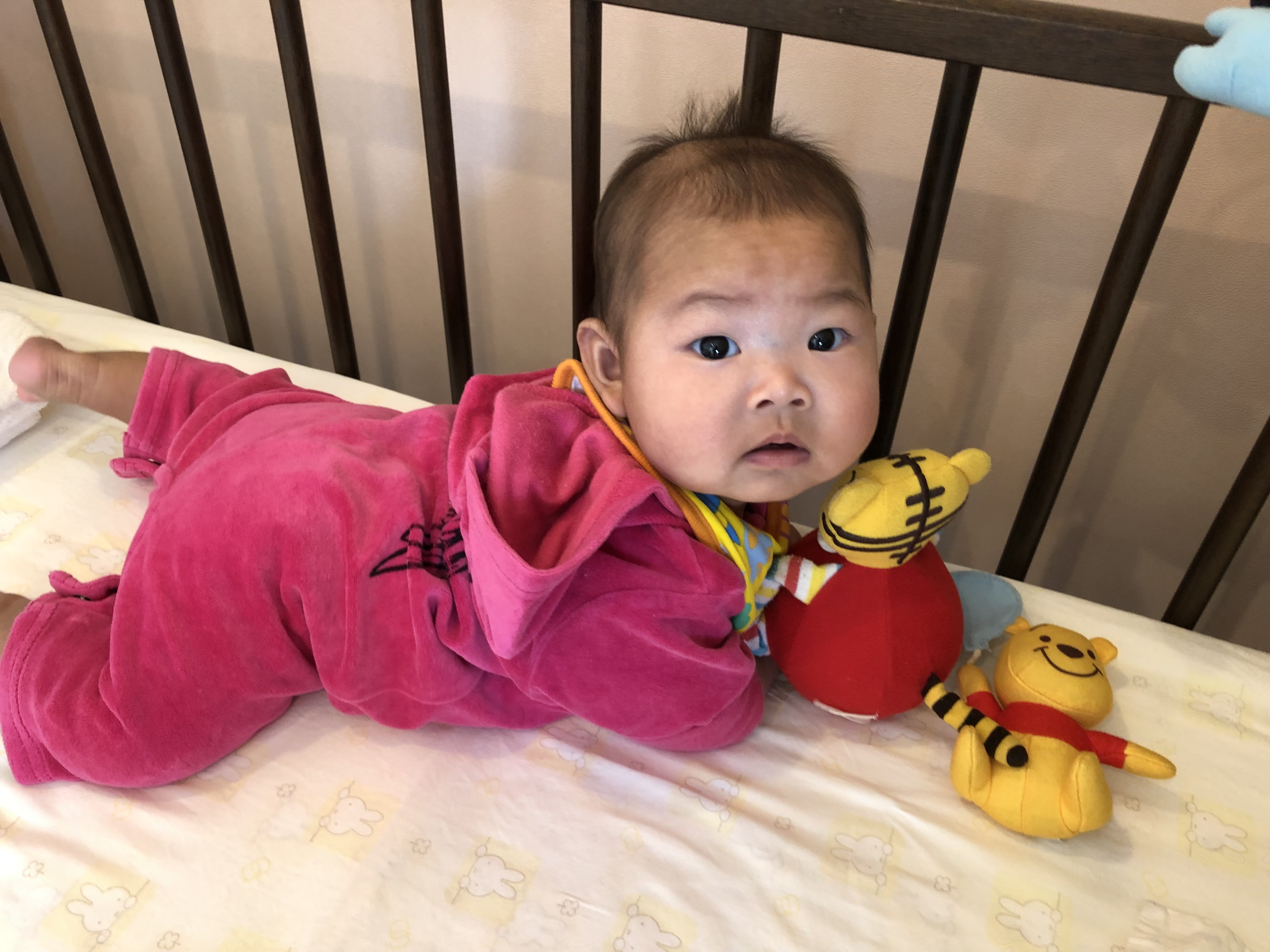 寝返りもコロコロされ、少しですがズリバイで前にも進めるようになっていました(^O^)/
