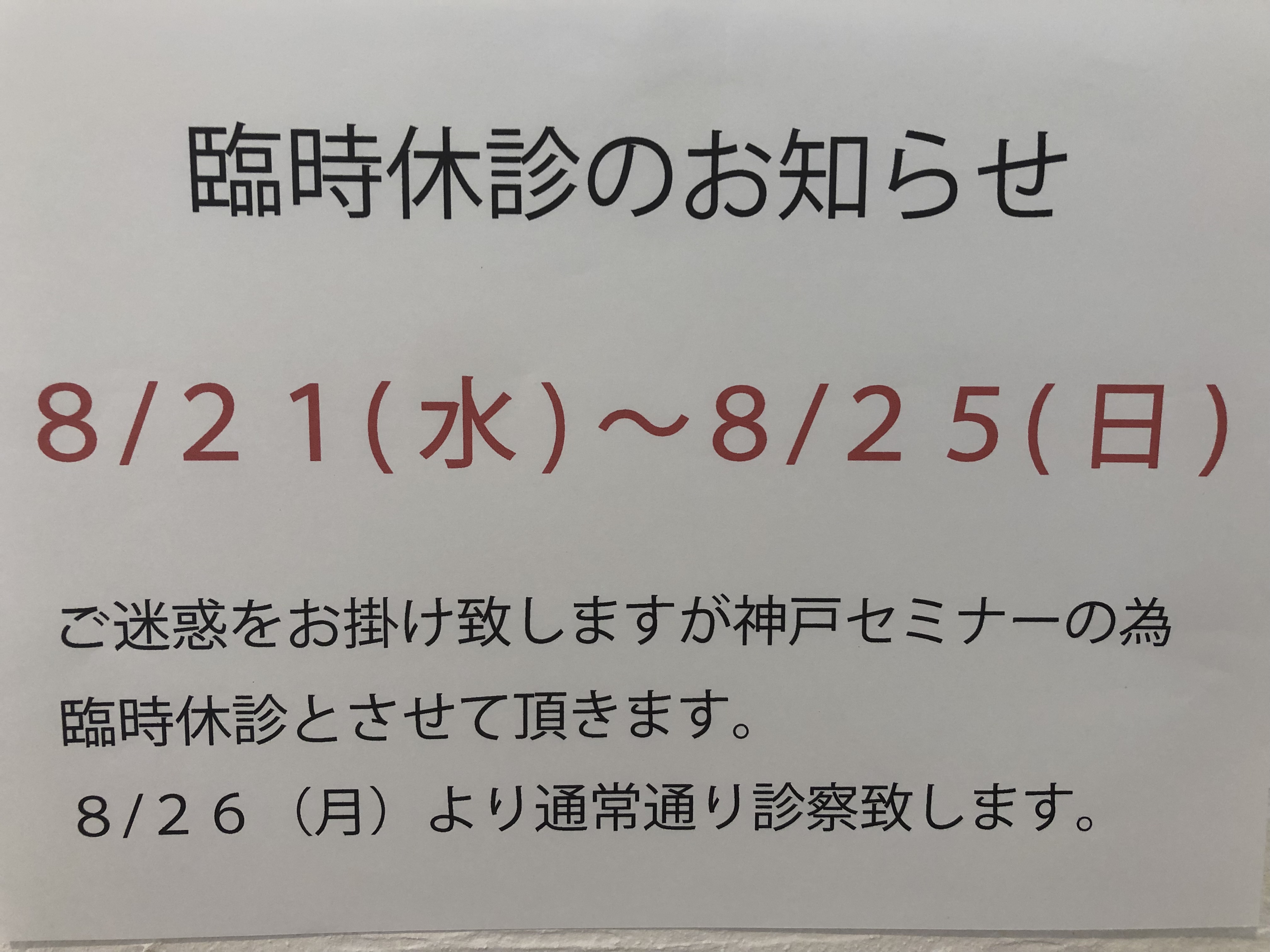 ポートカイロは、明日8/21(水)~8/25(日)までセミナーの為臨時休診させて頂きますm(__)m