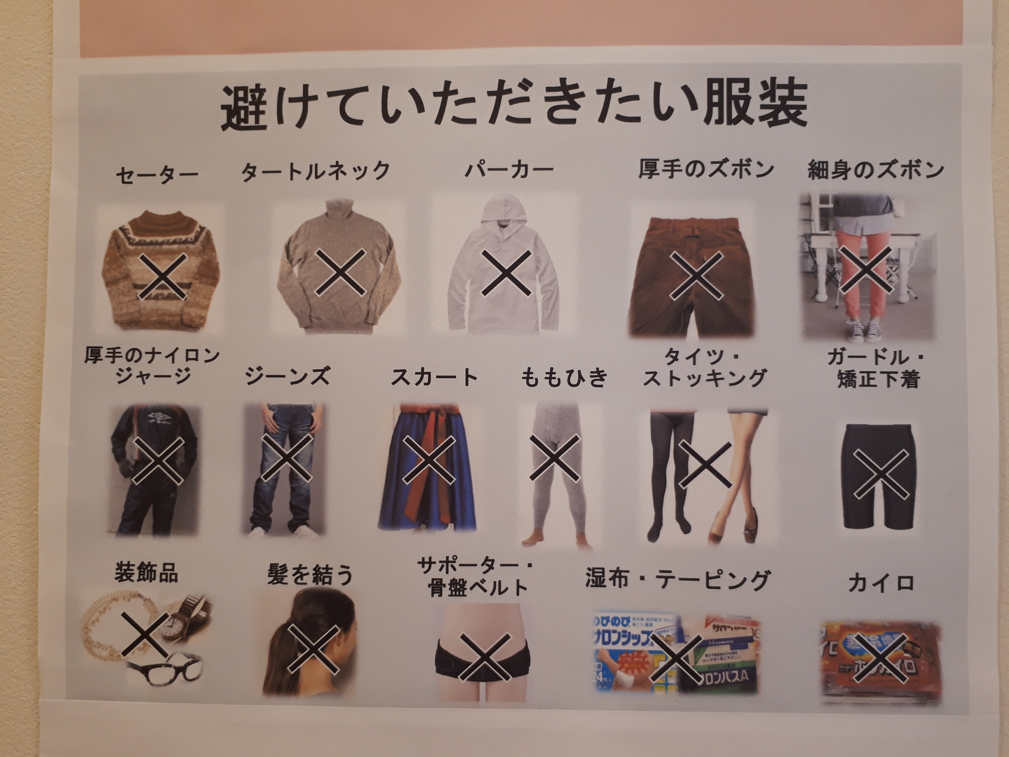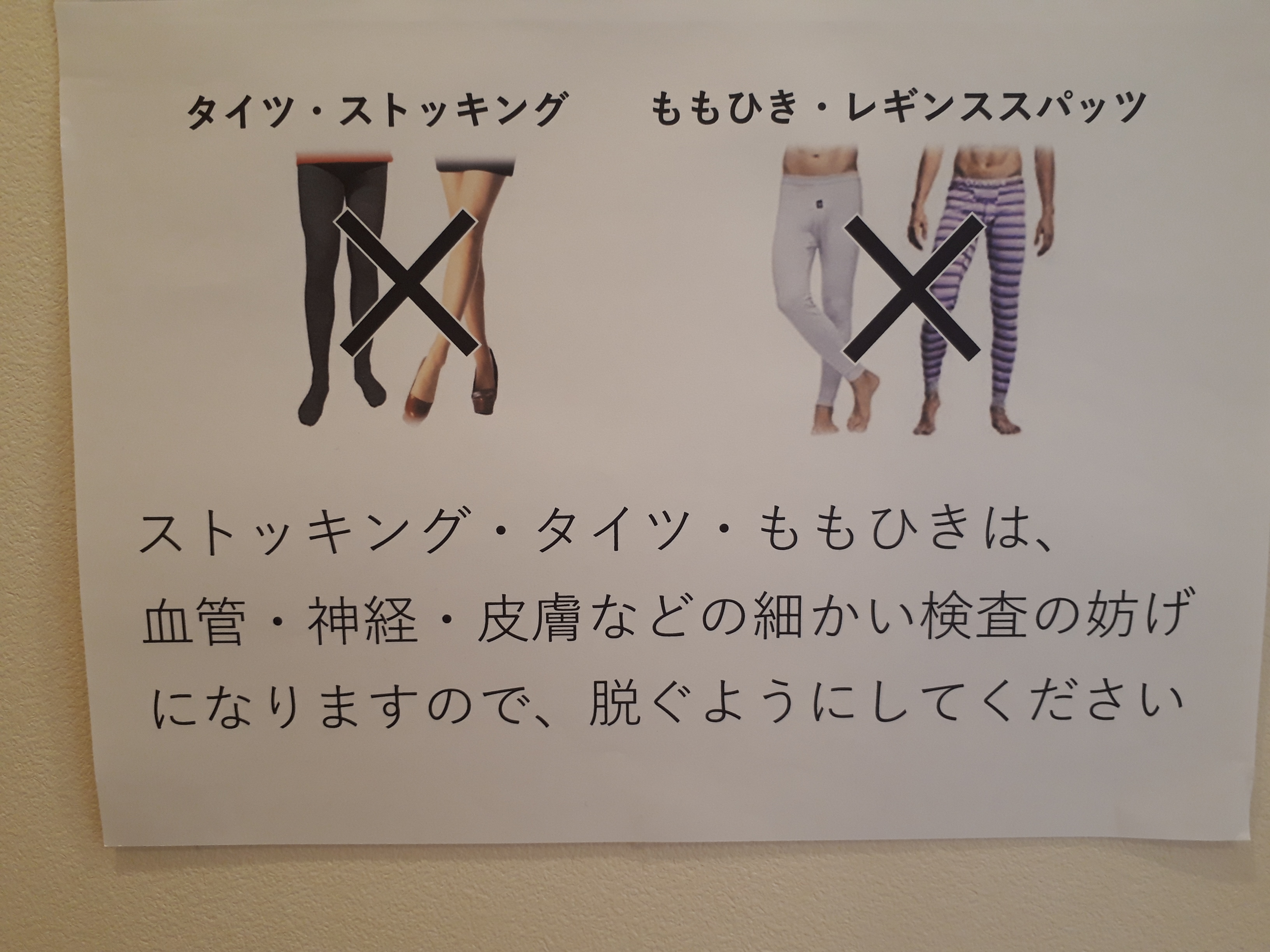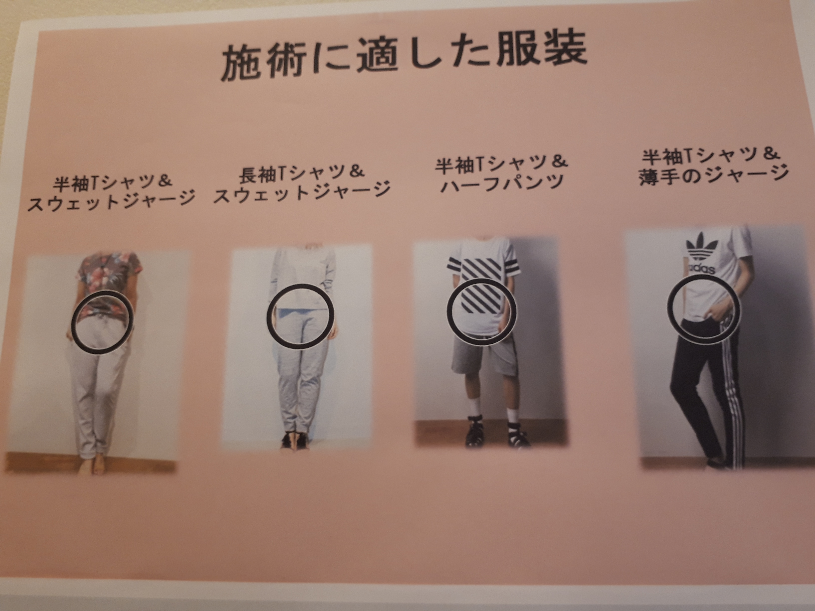 問診票をご記入して頂いた後お着替えをされる方は当院にもジャージのズボンをご用意しておりますので更衣室にてお着替えをお願い致します。
