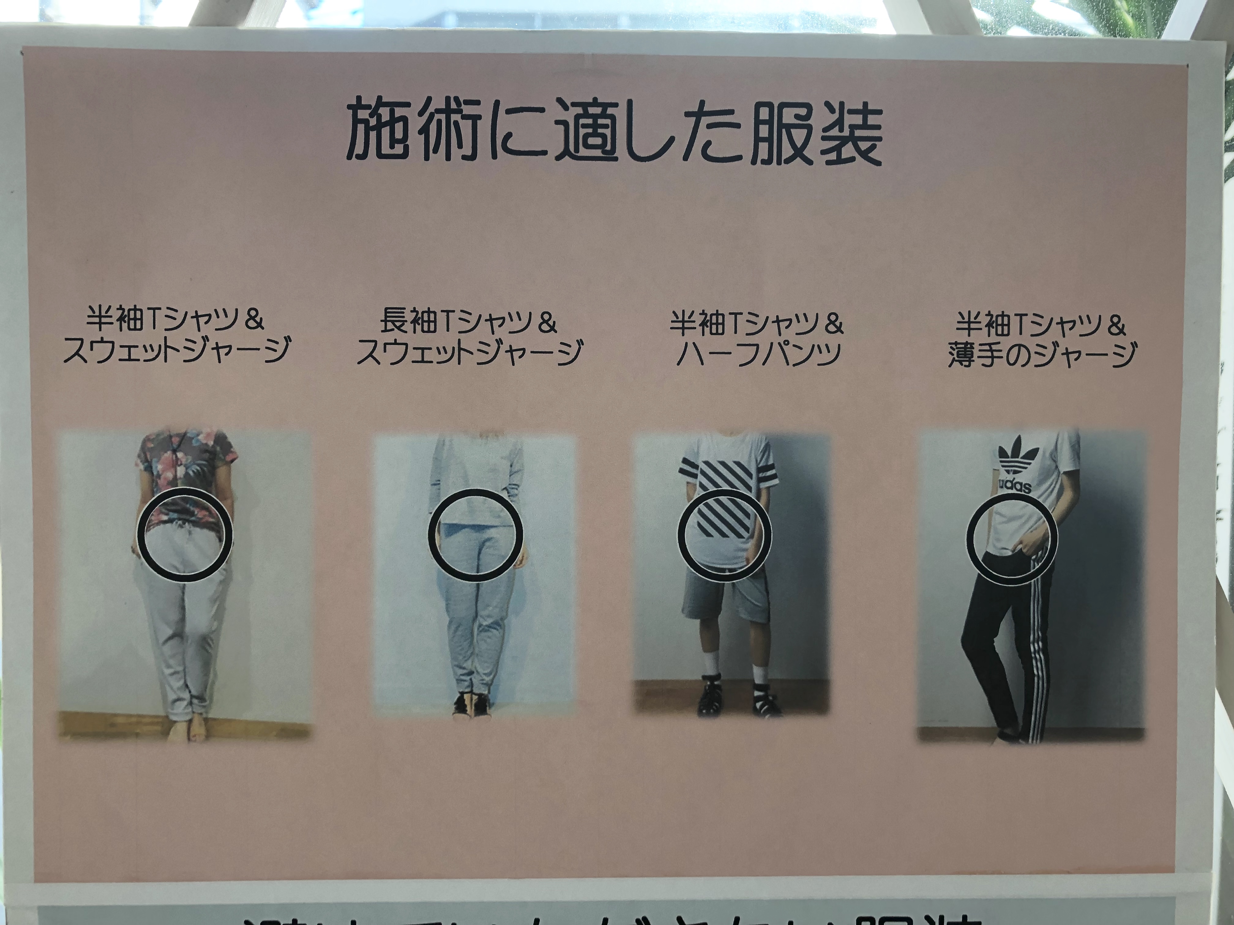 施術時は、薄手の首の空いたTシャツ、ズボンはジャージのような柔らかい伸縮性のあるものをお願いしております。