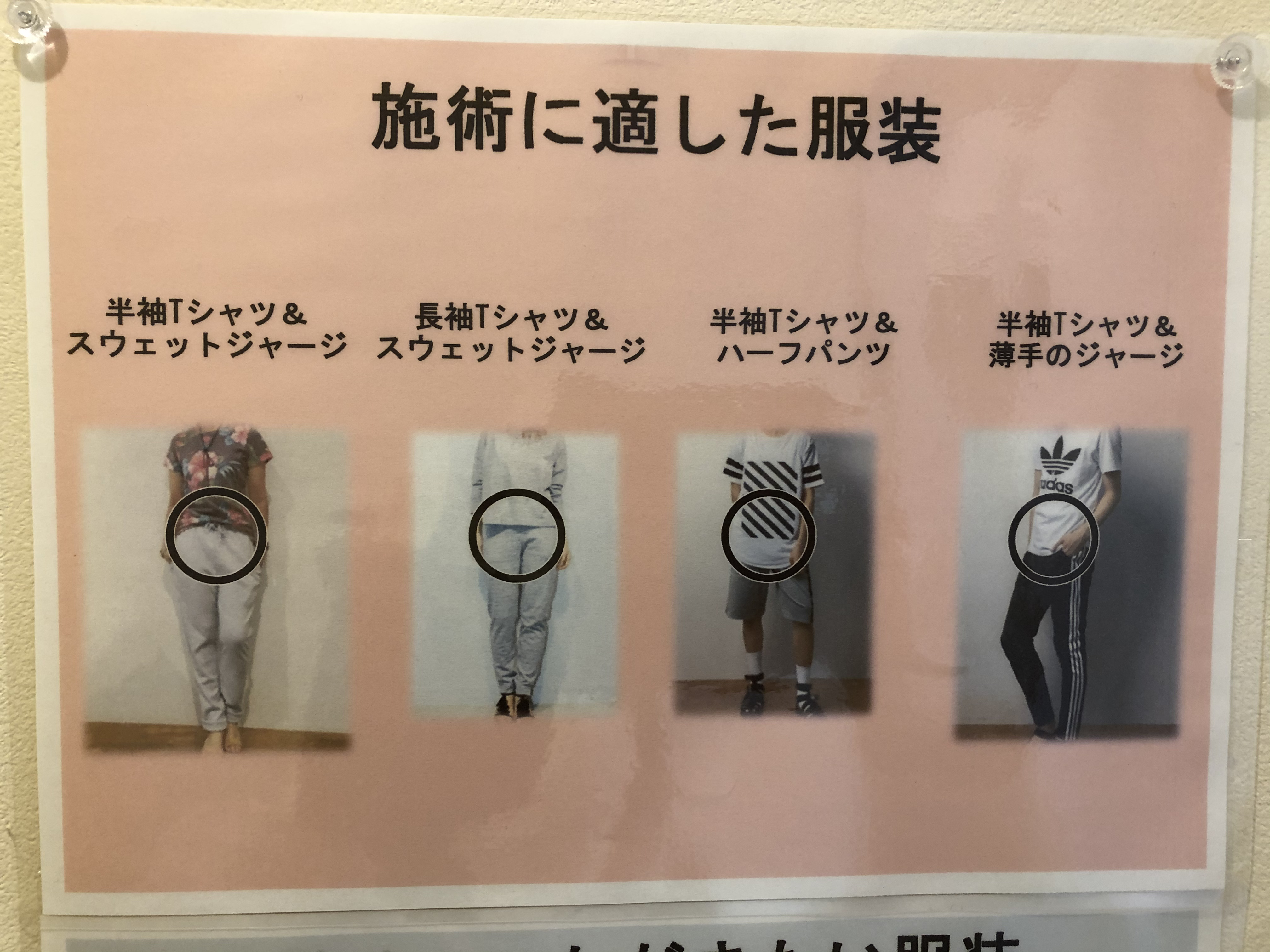 施術時は、重ね着・厚手のセーターやズボン、タートルネックセータなどは施術しにくいですのでTシャツ(長袖でも半袖でもOKです)とジャージ(ハーフパンツでもOKです)での施術をお願いしております。