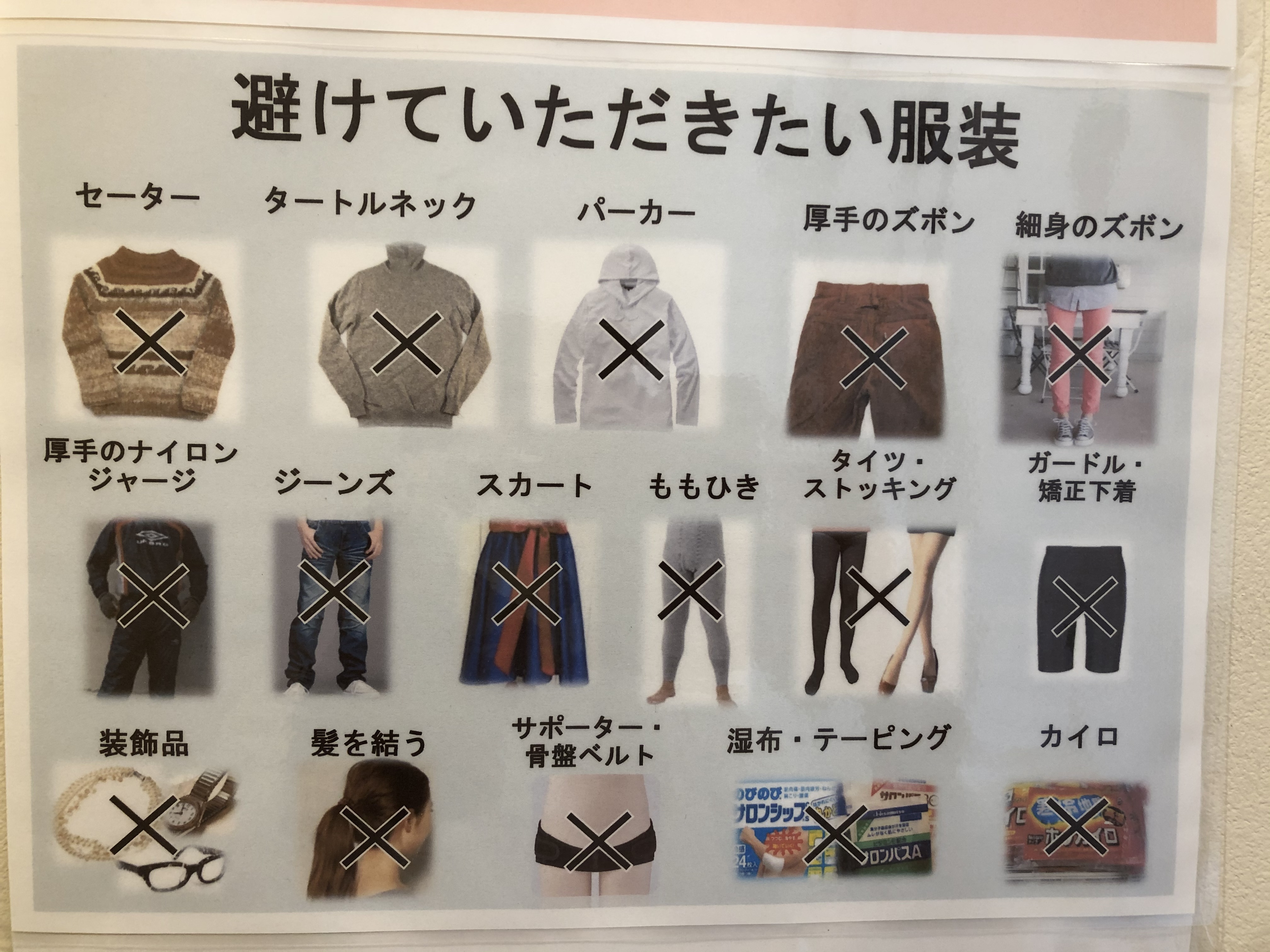 また、ジャージ下のストッキング・タイツ・ももひきは、血管・神経・皮膚などの細かい検査の妨げになりますので脱いでいただくようになります。