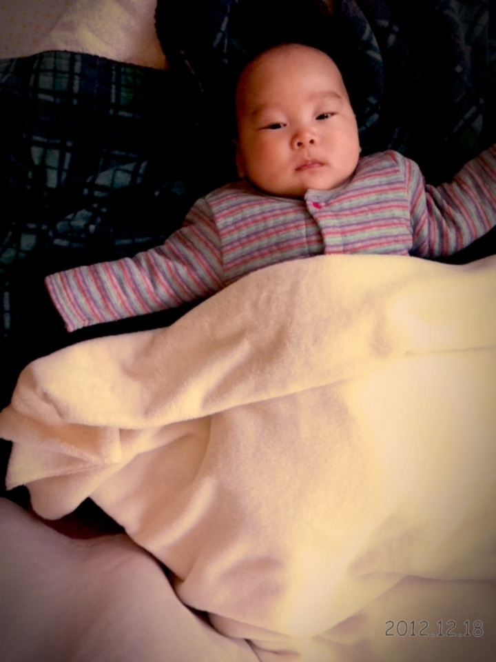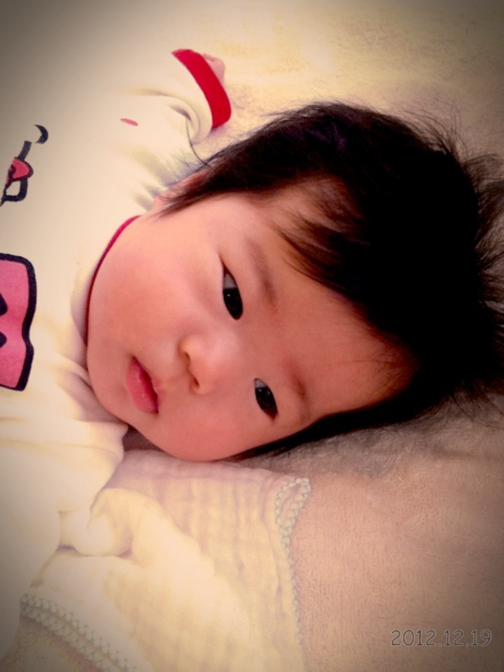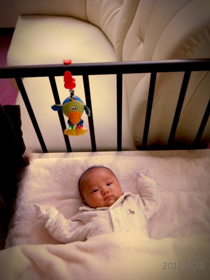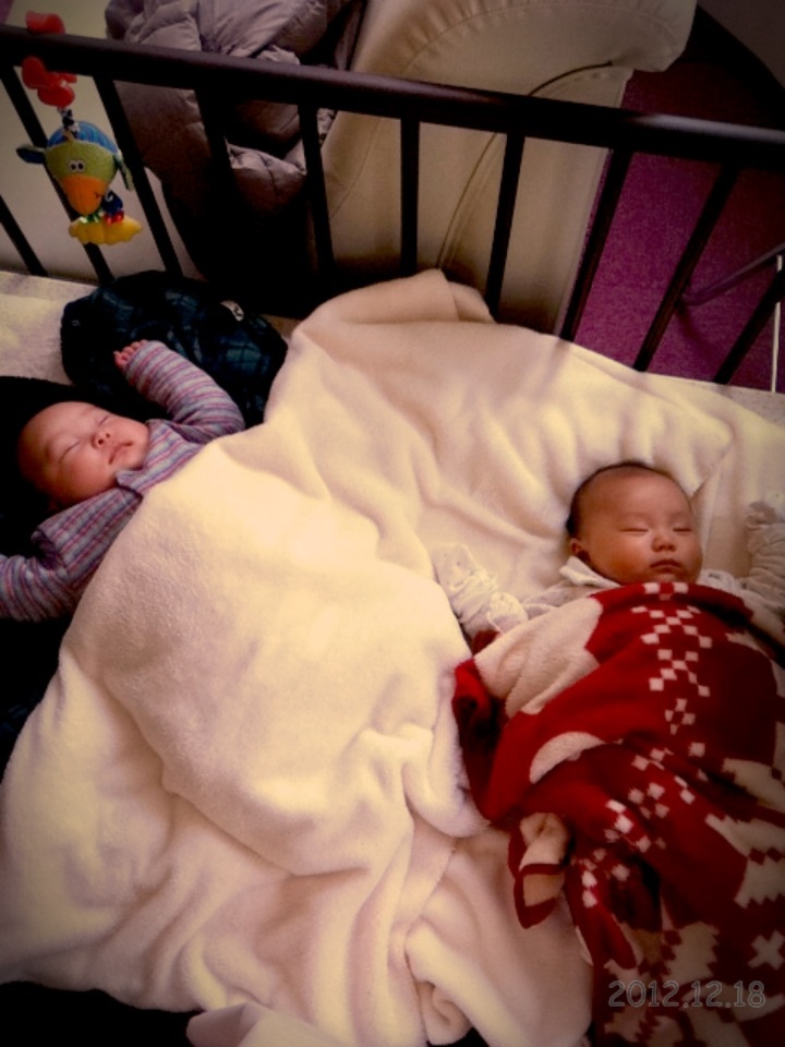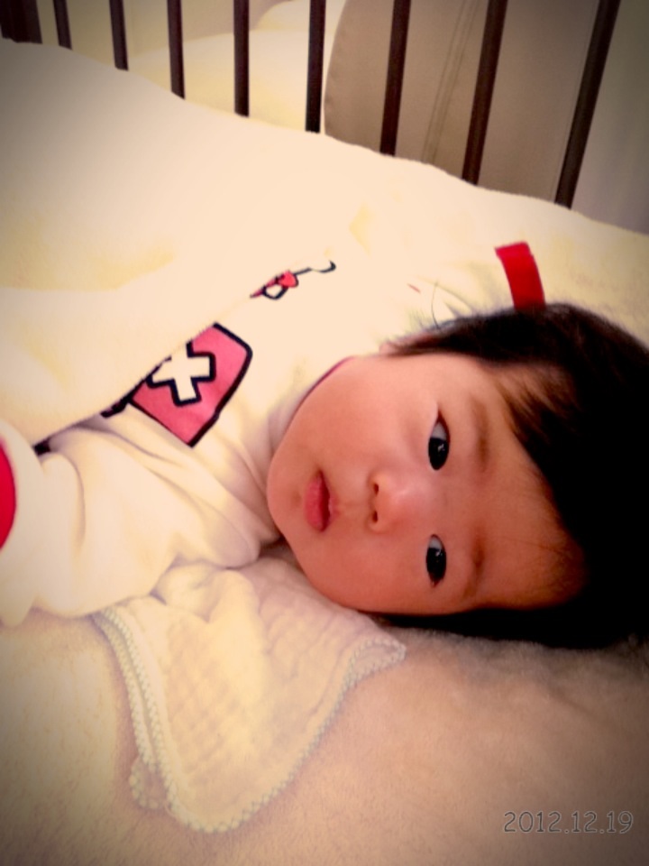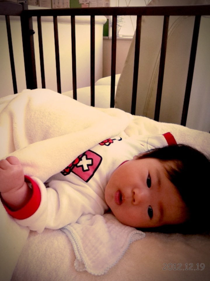Mちゃんを抱っこして寝かせていたのですが、同じ格好で寝ていたので、再度同じベットで記念撮影