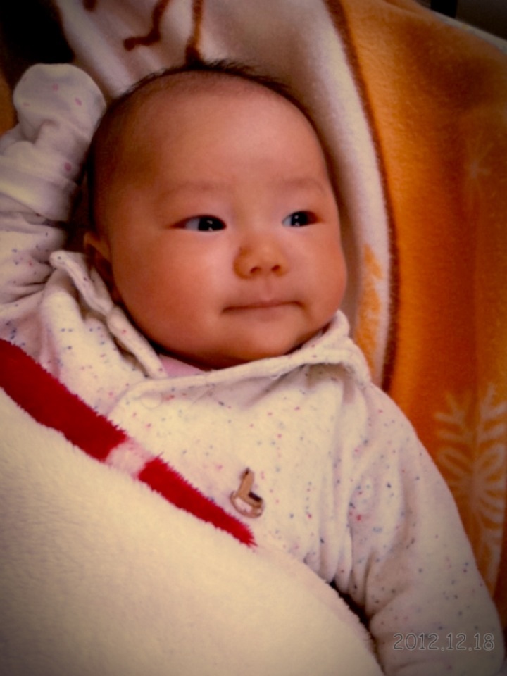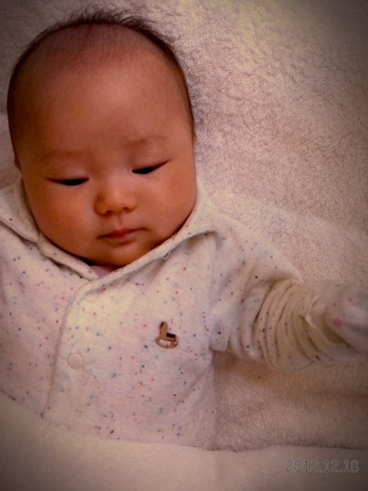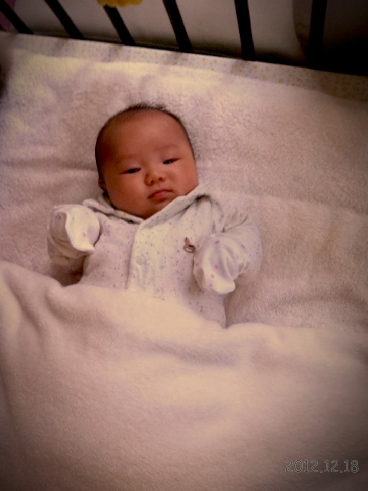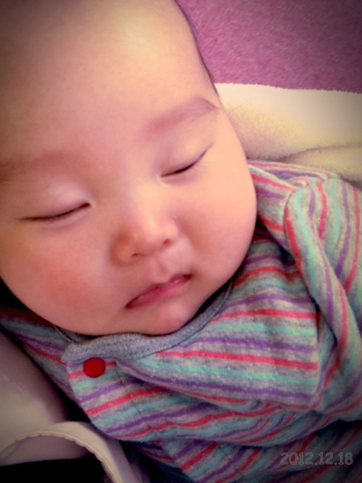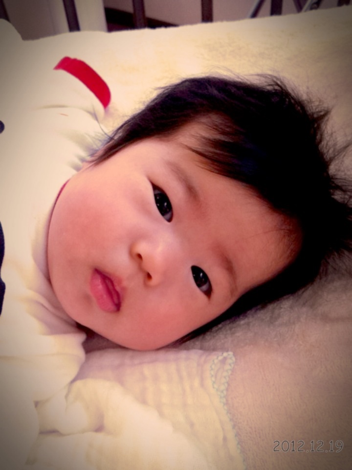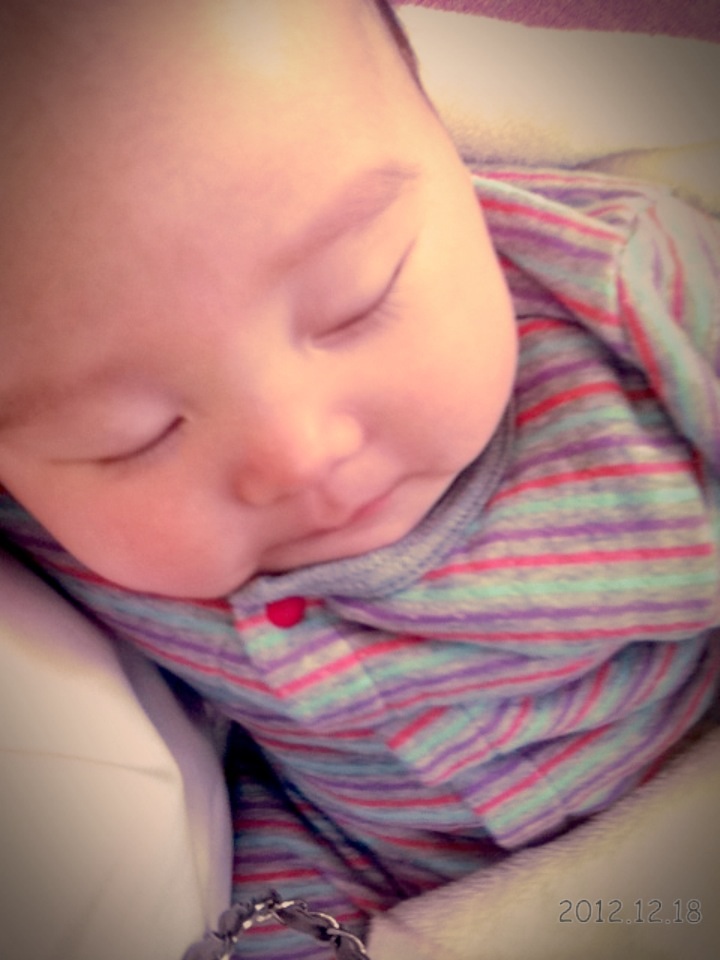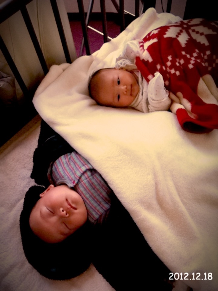 Mちゃんを抱っこして寝かせていたのですが、同じ格好で寝ていたので、再度同じベットで記念撮影