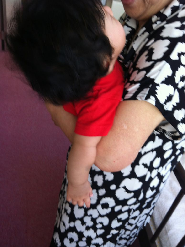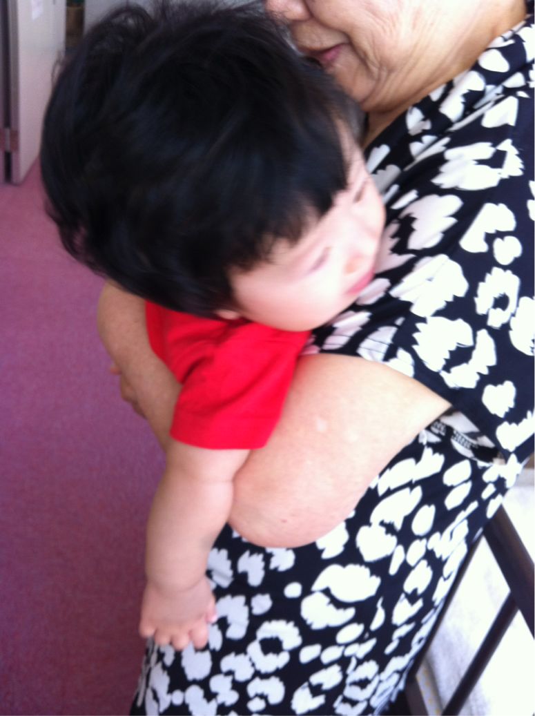 私が電話中で、S君が泣いていると、89才のおばあちゃんが抱っこしてあやしてくれていました