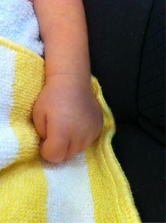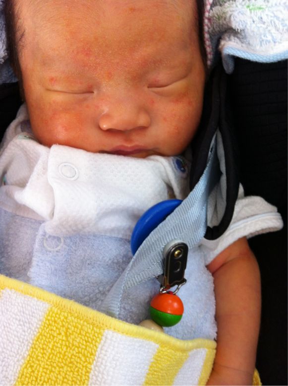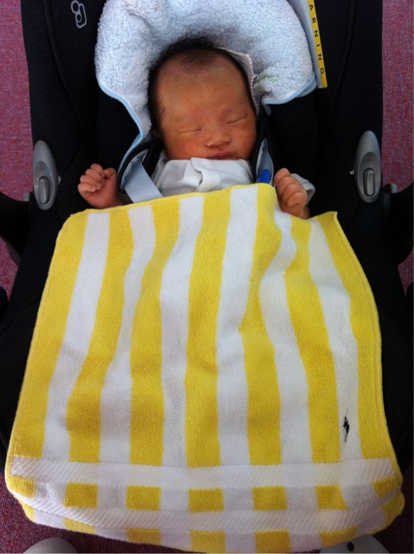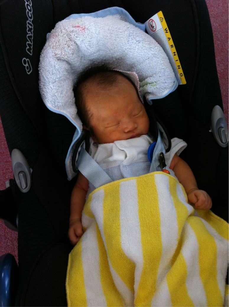 車の中から、チャイルドシートで寝たまま移動できるゆりかごの中でスヤスヤ