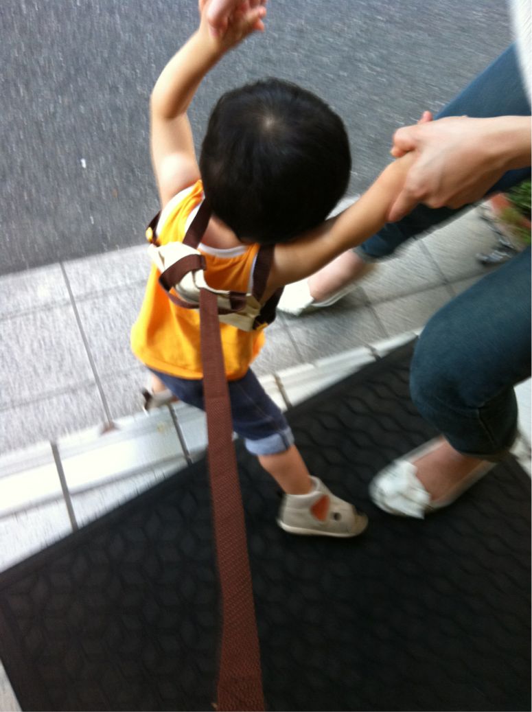 背負ったリュックから紐が出ていて、あっちこっち歩き回ってどこかに行ってしまう時も、この紐を持っていれば安心