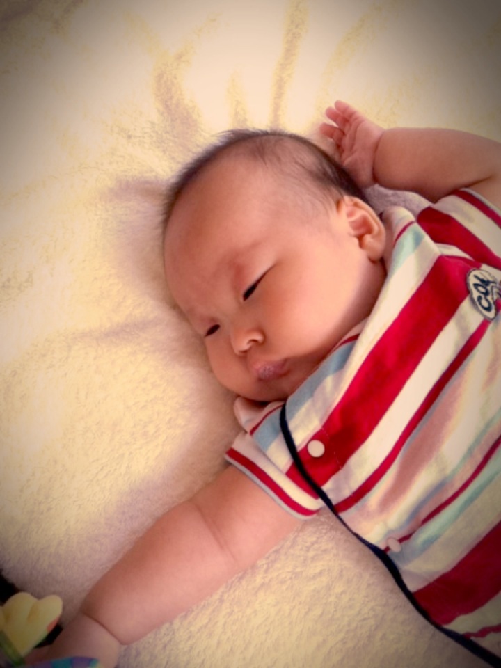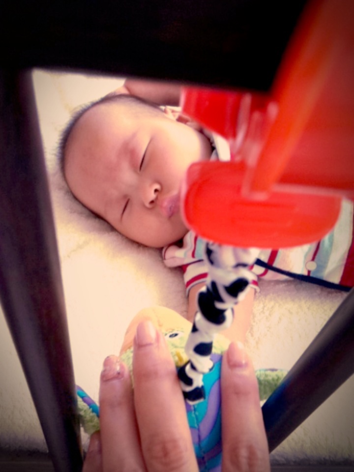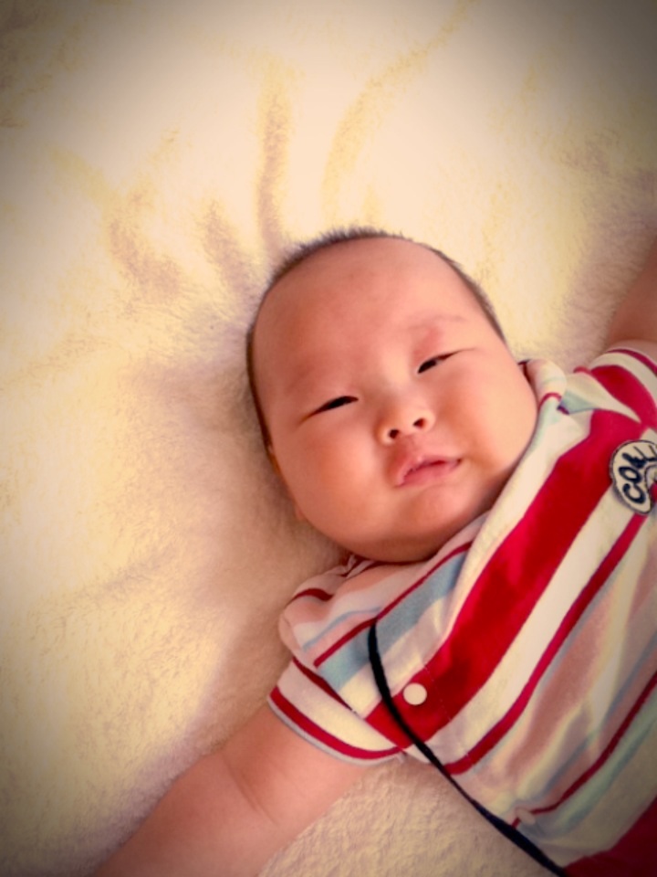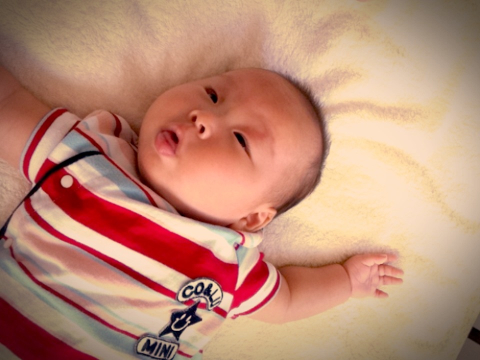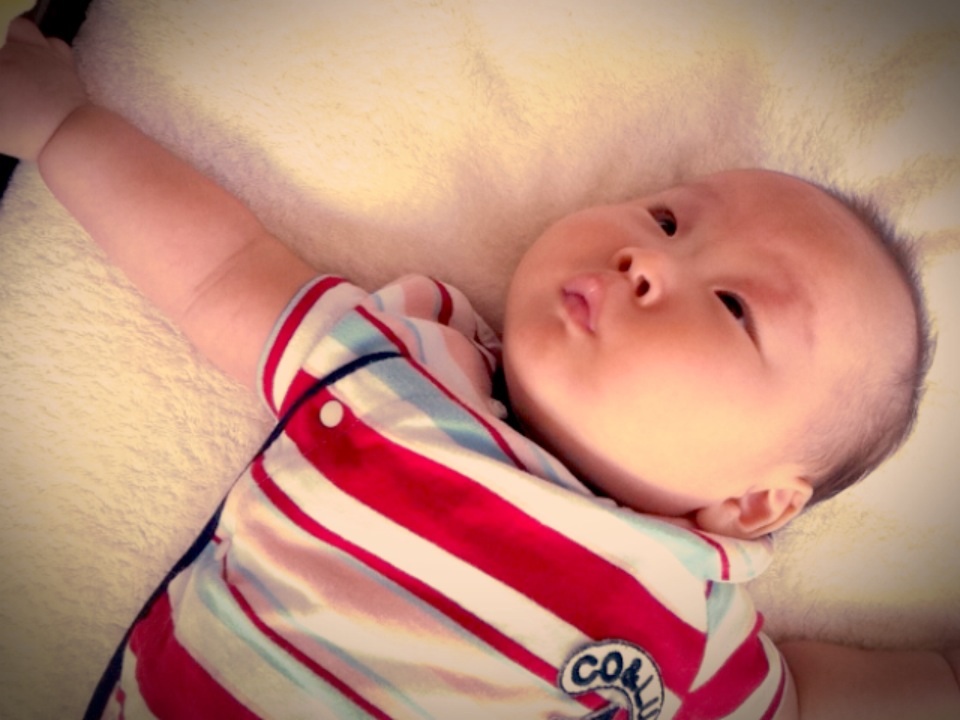2ヶ月のRちゃんは、おもちゃを見せて上や下に動かすと、目で追いながら顔も上下に動かします