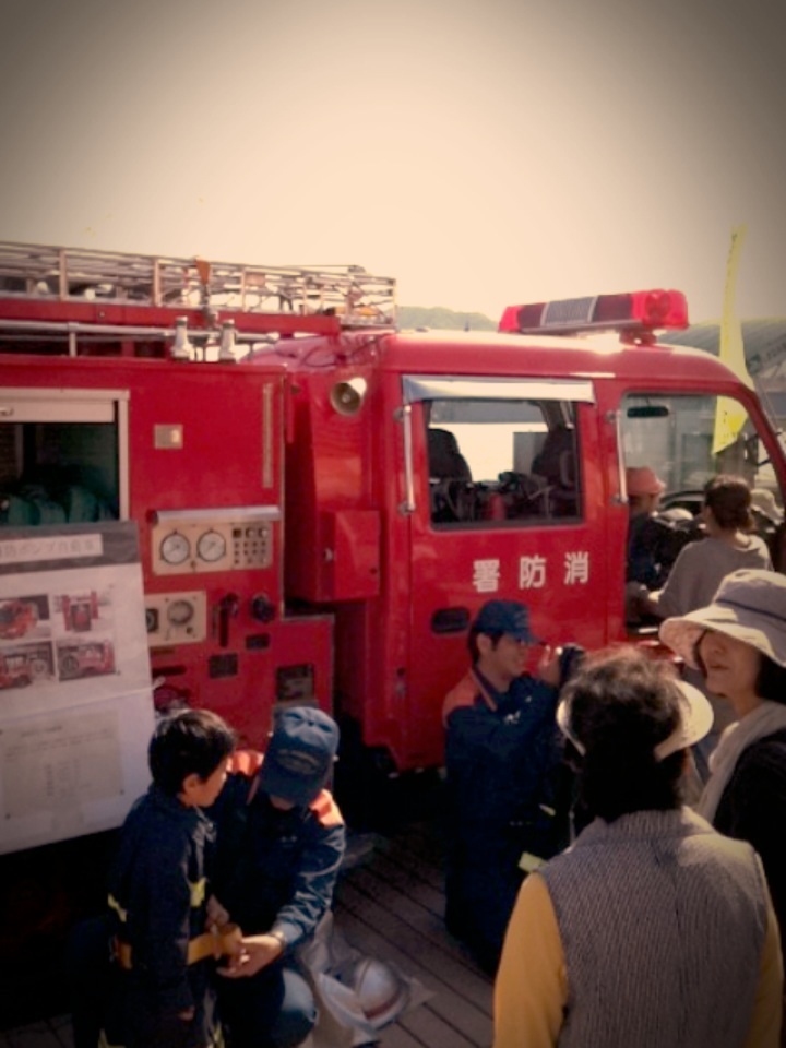 消防車の前で子供だちが撮影したり、中を見せてもらったり