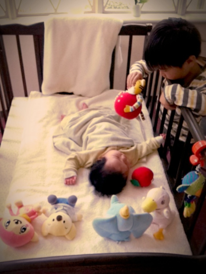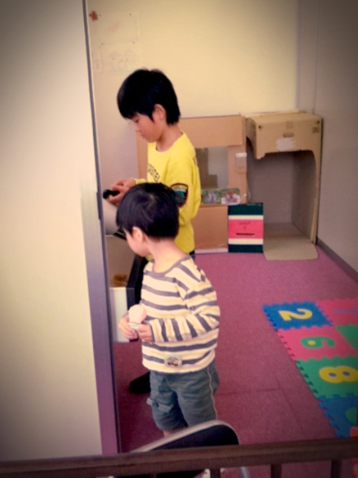 』とK君に教えてあげると、K君も赤のぬいぐるみで赤ちゃんをあやします