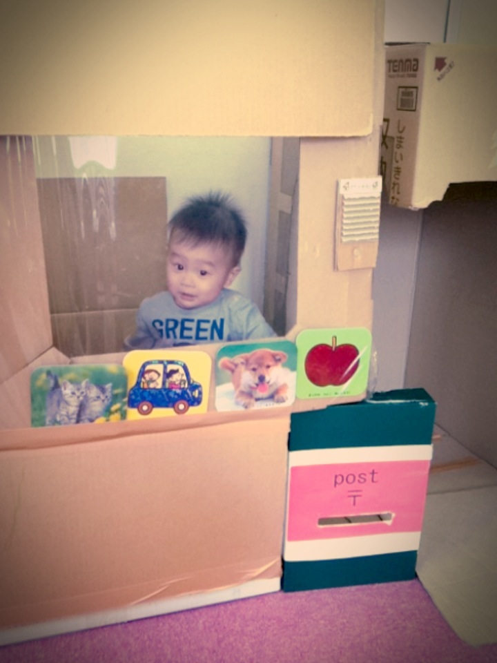 つかまり立ちができるので、ダンボールハウスを大喜びしてくれました
