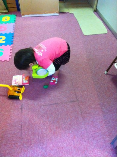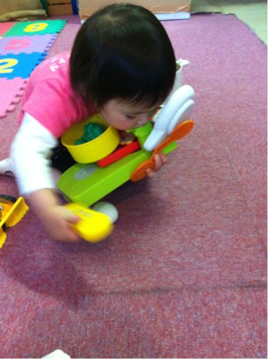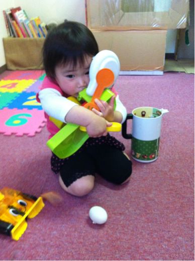 おもちゃを、一度にかかえて、他の部屋に行こうとするYちゃんですが…小さな腕におもちゃが溢れかえり、持てても歩いたら落ちたり、拾ったり…