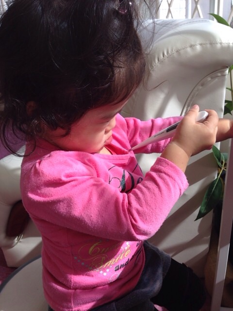 最初はRちゃんおもちゃなどで遊んでいたのですが、ママや次の患者さんが血圧を計っているのを見て自分もやりたくなったのか自ら椅子に座って血圧を計るマネをし始めました(^^)♪