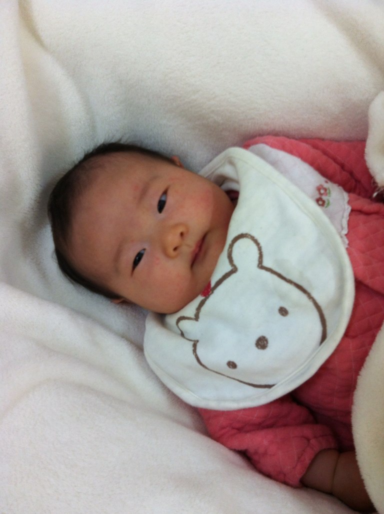 Nちゃんはママのスリングのなかで最初寝てましたが、下ろされるとちょっときがついて、薄めで周りをうかがってるようでした。