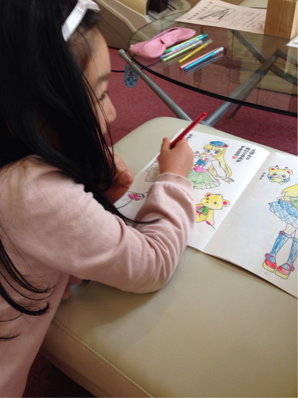 ぬりえの女の子達のお洋服をKちゃんがどの色にしようかと考えていました(^^)