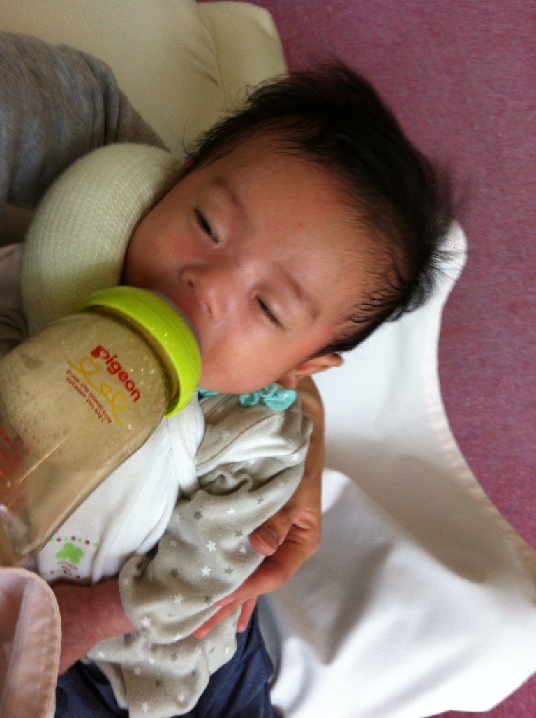 こちらは、産後の骨盤矯正や手首の痛み、その他の症状もおありで通ってくださっているママと一緒に来てくださってるTくんです。眠たくて、ミルクを飲みながら私の腕の中でうとうとされながら、ママを待ってくれました。ゲップも上手にできたね!