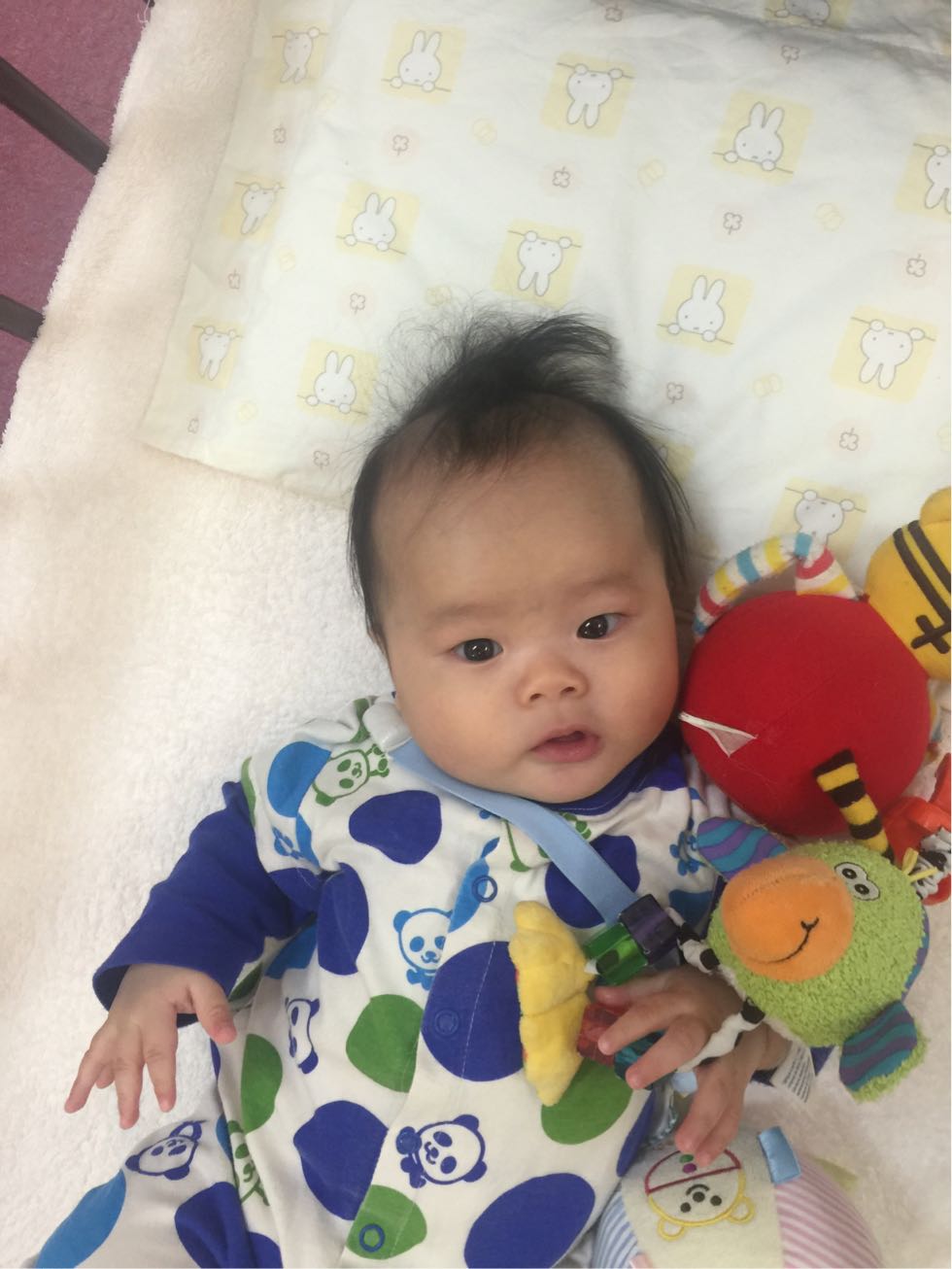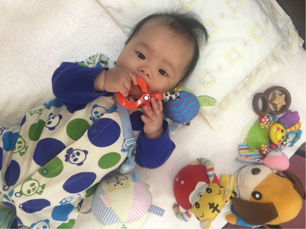 おもちゃに興味を持ってくれて、手で握ったり、お口に持っていかれたり、上手に遊ばれながらママを待ってくれていました。可愛い仕草に何枚も写真を撮ってしまいますね
