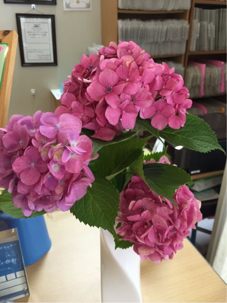 今日は曇ってますが、週2回のペースで来らています患者さまが、今日も可愛い紫陽花を持って来てくださいました(o^^o) ポートカイロの入り口は、華やいでいます。ありがとうございます。