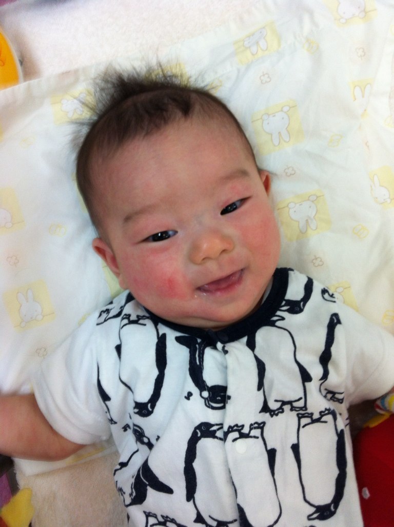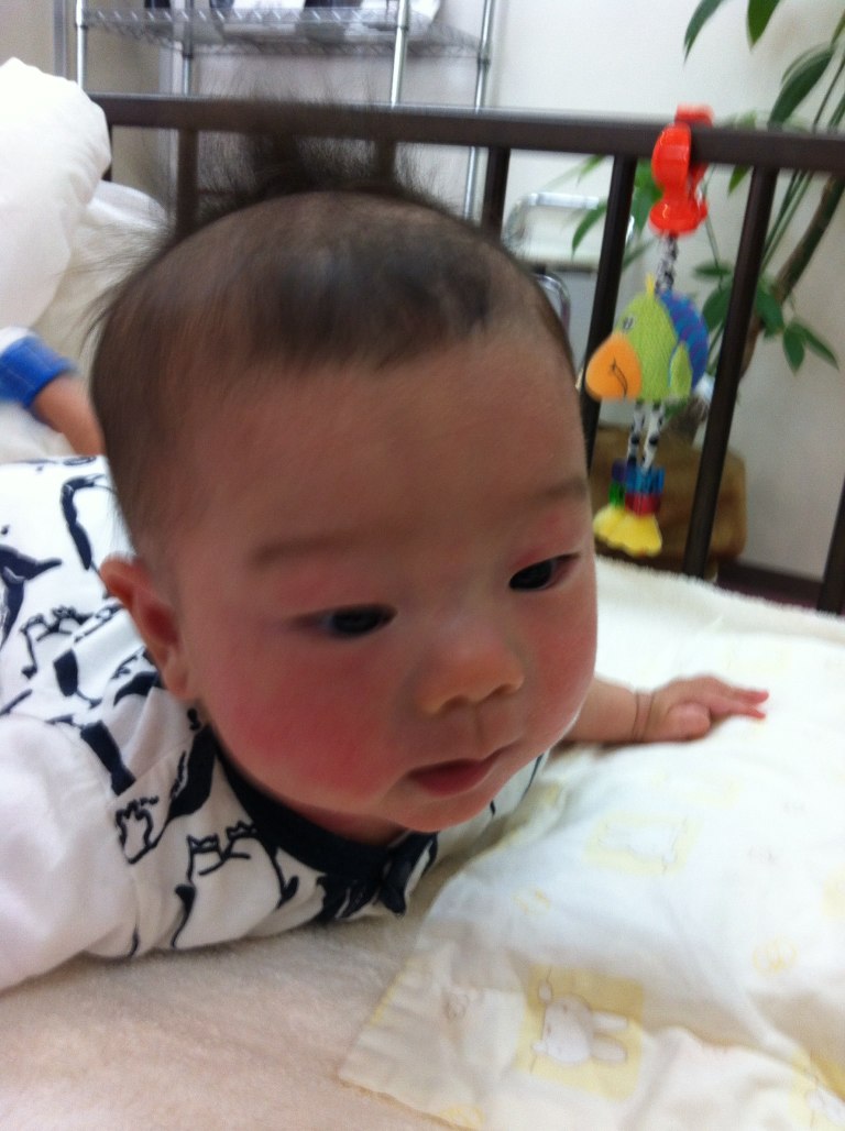 得意の寝返りです。長い間、この状態でも平気そうなSくんですが、私が心配で、時々仰向けになって休憩してもらいました(笑)
