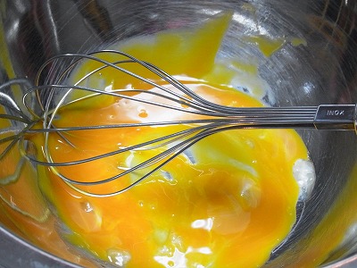 卵黄の中に砂糖を入れ湯銭で溶かします