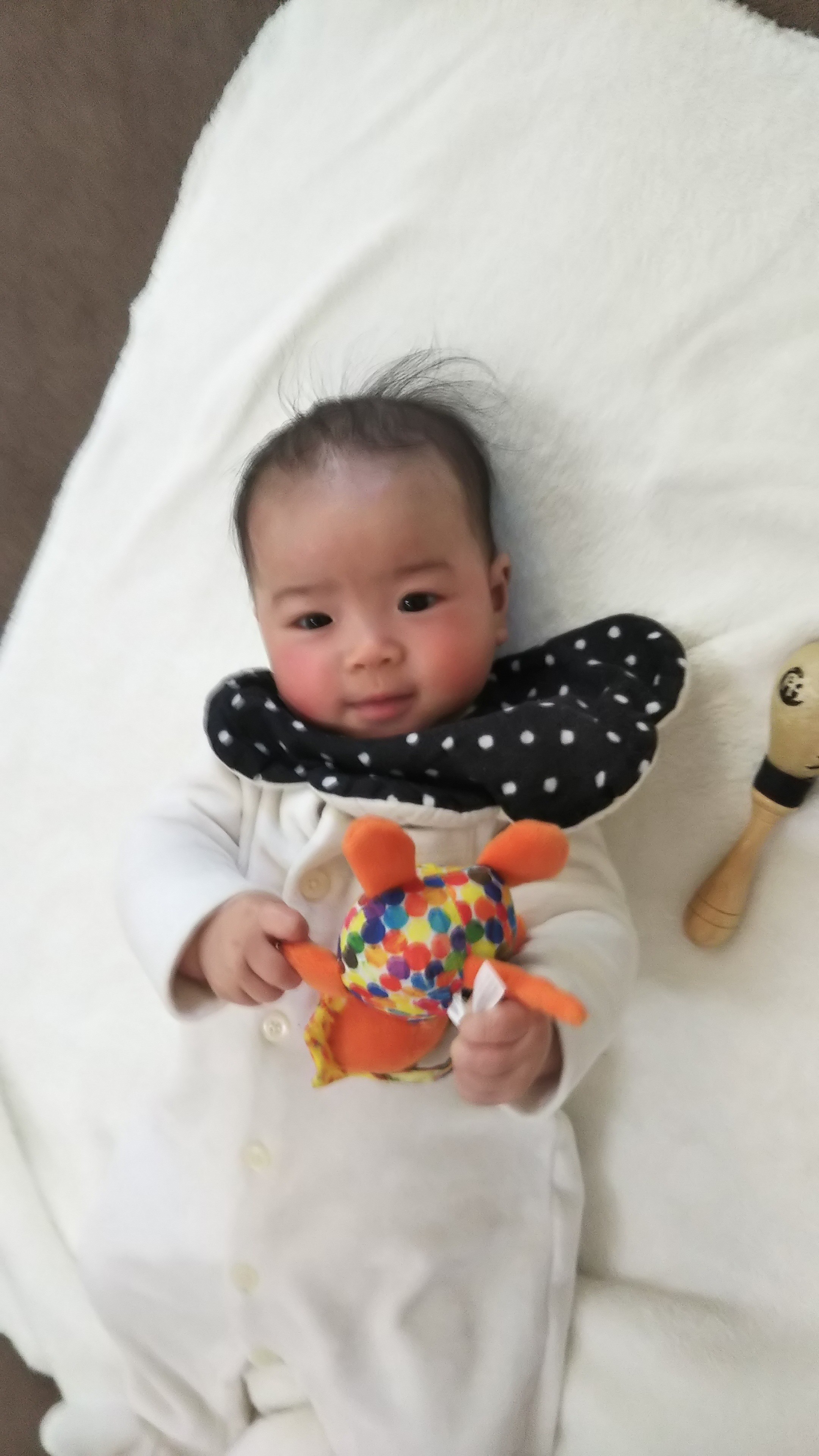 おもちゃを握ってフリフリしたり、足もバタバタ元気に動かされて、ご機嫌で過ごしてくれました。私にも沢山笑顔をくれて癒されました("⌒∇⌒")ありがとうね(^з^)-☆