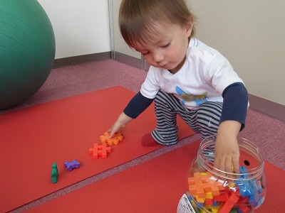 早速、ブロックに必死で遊んでいます