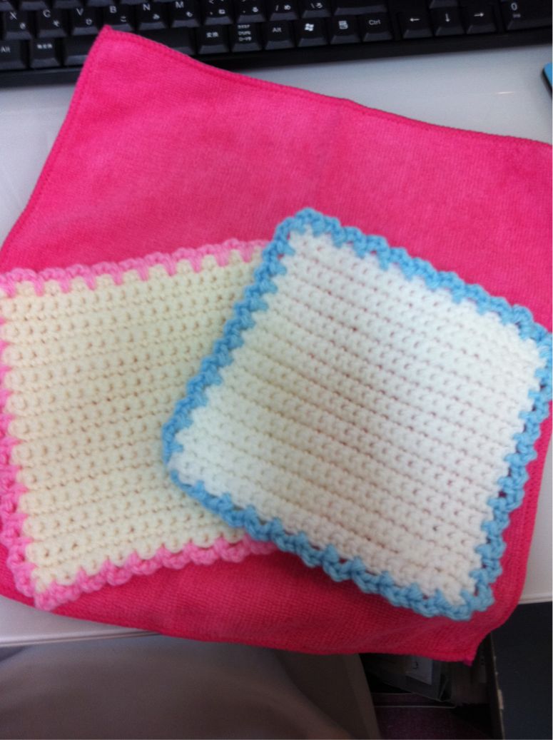 膝の痛みで治療に来ている患者様から、手創りの、毛糸で編んだ食器を洗うものと、シンク磨きの布巾を頂きました~