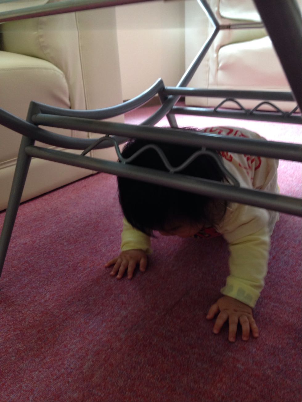 そして、机の下にもぐって頭を打たないように頭を下げながら机の下を通過したKちゃん!
