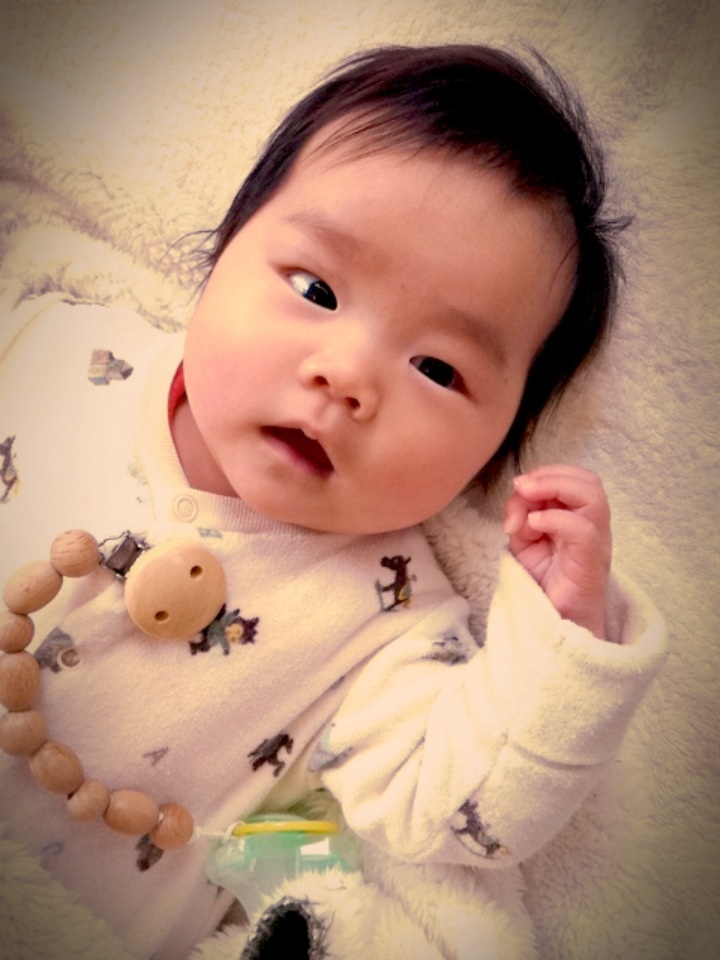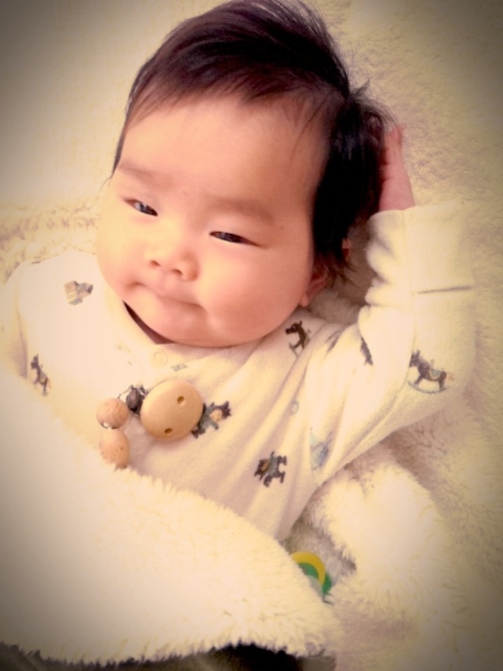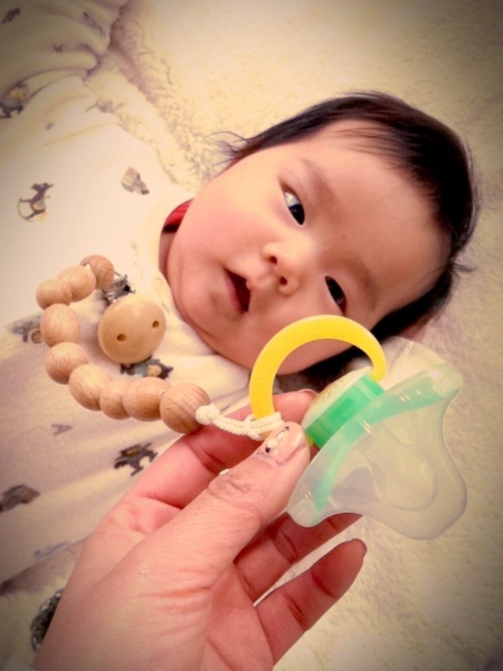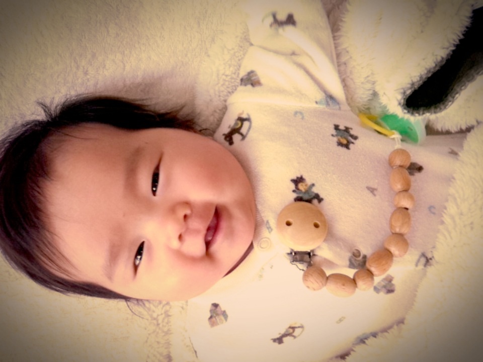 おしゃぶりデビューもしたそうで、おしゃぶりを付けているストラップ?が木でとっても可愛いんです
